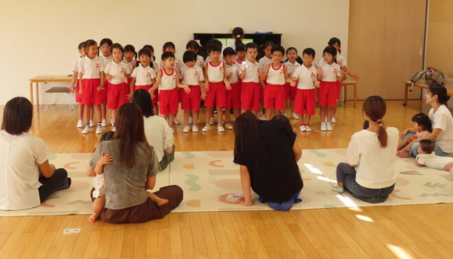 年長児マーチさんが『♫ 手のひらを太陽に』を歌ってくれました。                                  かわいい振り付けを真似して、一緒に踊っている子もいましたよ。