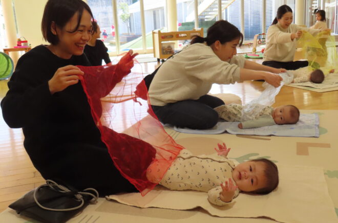 『オーガンジー』を使った布遊び💖色とりどりのキレイな布が目の前をふわっと舞うと赤ちゃんたちは目で追ったり、喜びの声を出したりヒラヒラしたりして楽しみました。