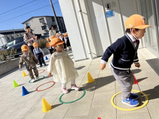 みそら神社の参道には、試練のようなケンケンパが…。子どもたちは真剣に輪っかの上をジャンプし、園長先生の元へと進むと…