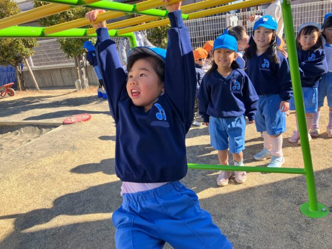雲梯だよと紹介すると、「遊んでみたいな~」と早くも興味津々でした!園長先生に遊び方を教えてもらい…いざ挑戦!