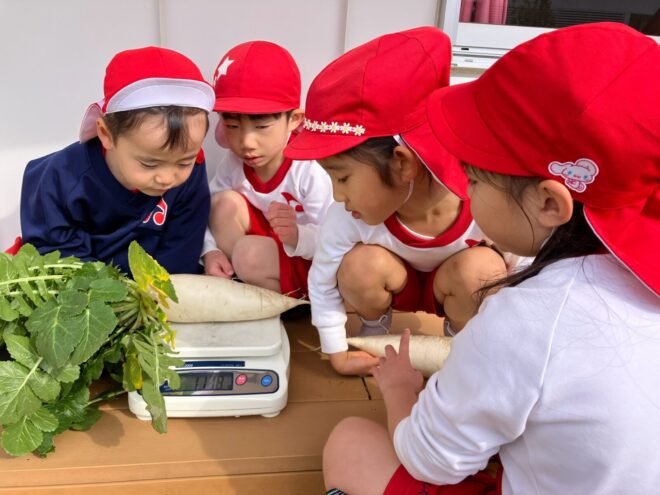 収穫後もメジャーや量りを使って、長さや重さを測って楽しんでいた子どもたちです♬