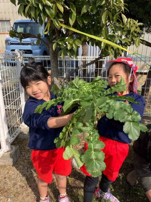 みんなが大切に育ててきた冬野菜(大根&ブロッコリー)が収穫できました!収穫後の大根とブロッコリーの大きさに驚きながら収穫を楽しんでいましたよ♬