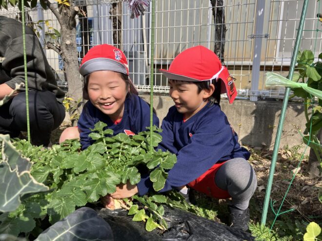 収穫を通して、様々な発見や気付きもあった子どもたち♬大根の虫食いに興味を持ち、土の中を何がいるのか探してみたりブロッコリーの茎の部分から収穫することを初めて知ったりといろいろなことに興味を持ち、学ぶことができましたよ😊