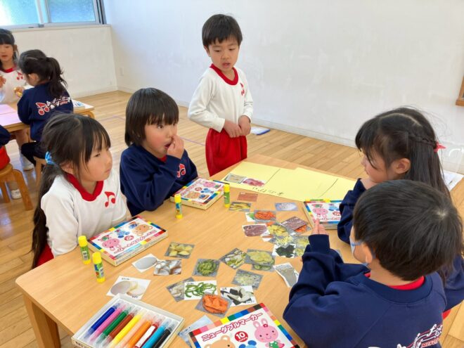 今月の食育は…たくさんの食べ物からどんな料理ができるのかみんなで話し合い、発表する内容でした。4つのグループに分かれ、話し合いをしていった子どもたち!以前から話し合いをしていることもあり、最近では子どもたち同士で話をまとめられるようにもなってきました。「これとこれが入れば○○ができるんじゃない?」「これとこれで何ができるのかな?」と友だちと考えながら意見をまとめようとする姿に成長を感じましたよ♬