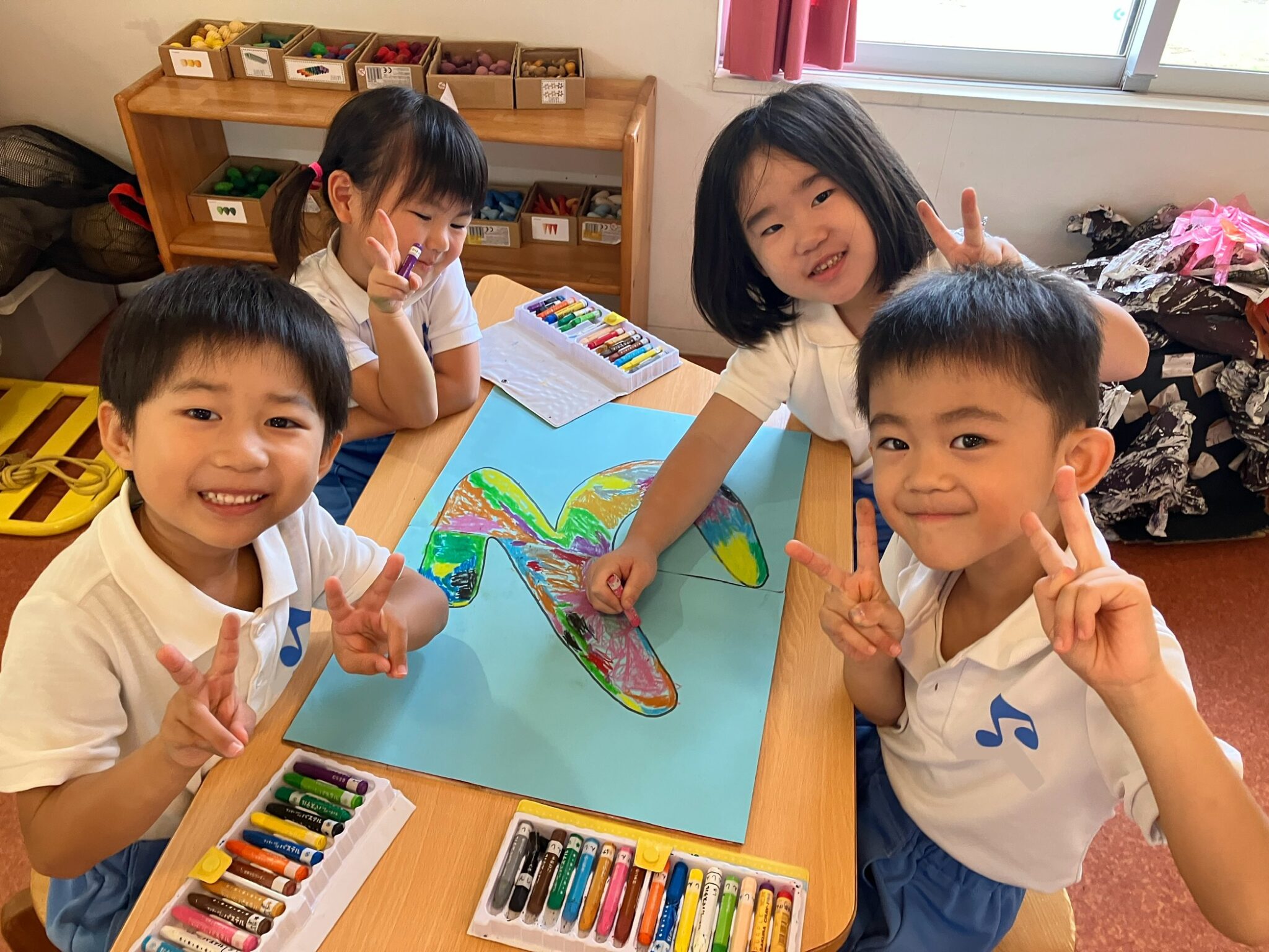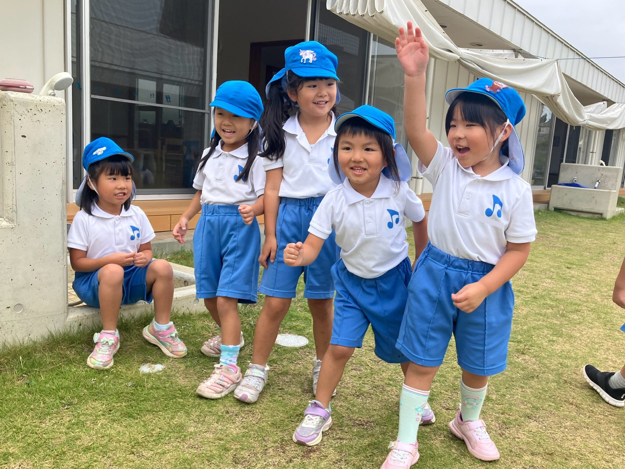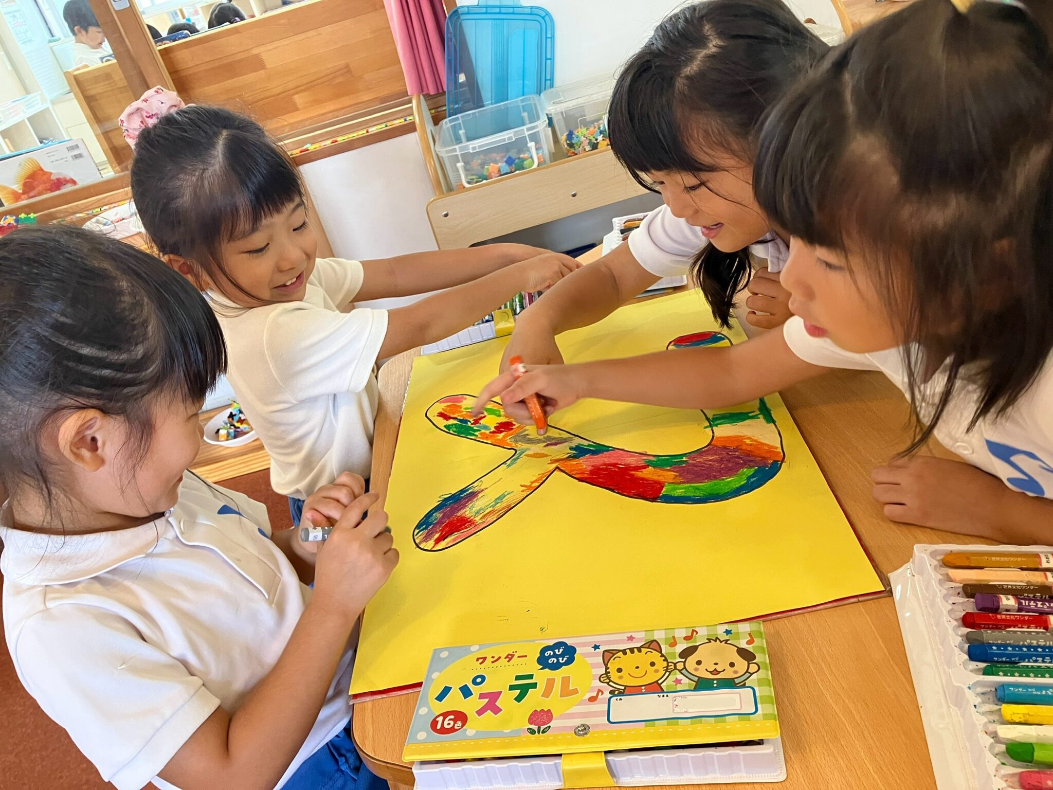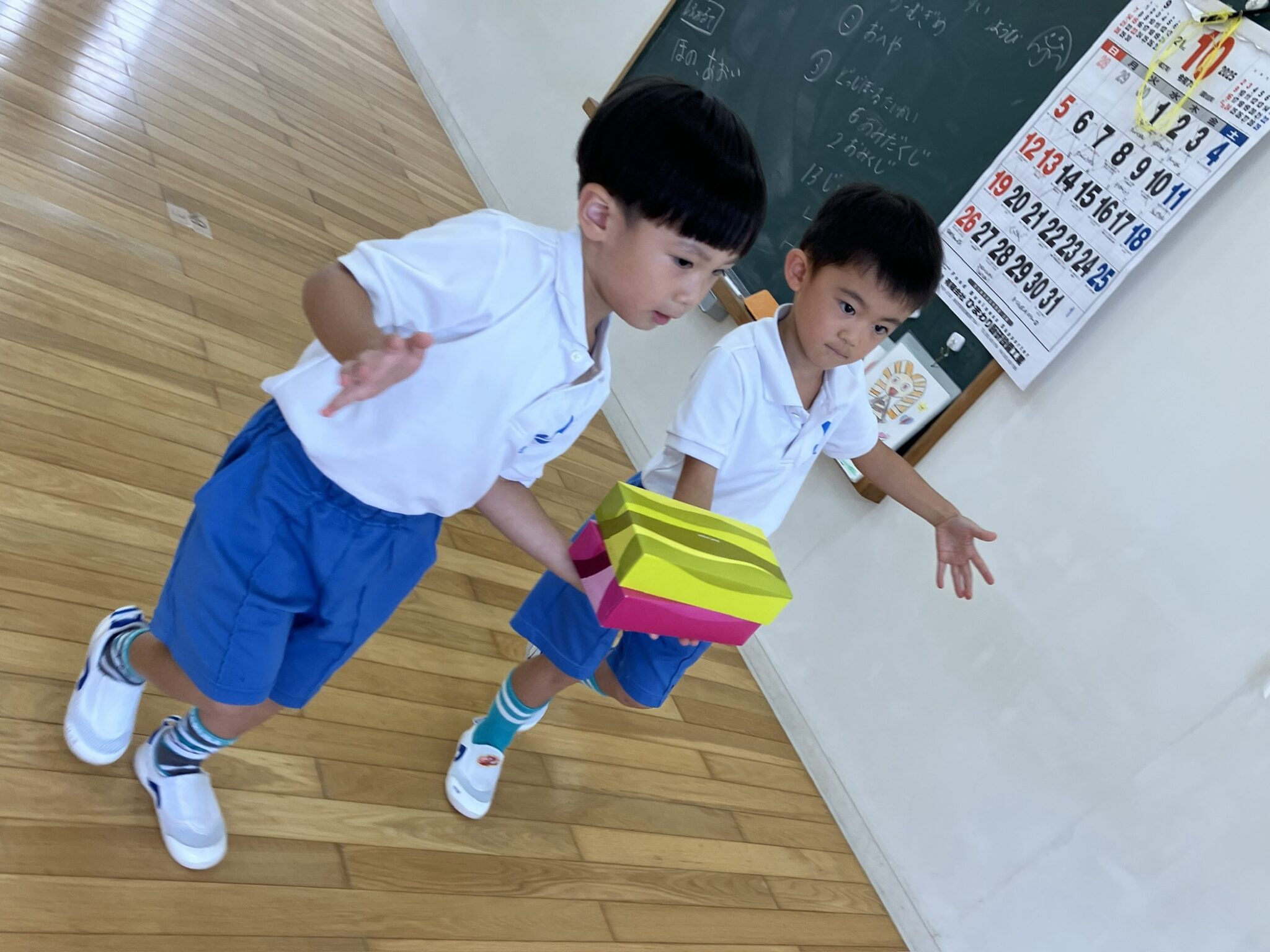 ダンスで使った「いろとりどり」のパネルはフォルテのみんなで色を塗って作りました。「ここは黄色にしよう」「ここは僕が塗る!」と友だち同士で会話を楽しみながら協力して取り組んでいた子どもたち。カラフルな素敵な作品となり、運動会を彩ってくれました。運動会を終えまたひとまわり成長した子どもたちです。