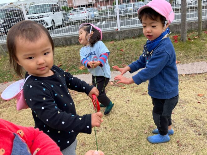 園庭にカラスウリのツルを見つけると大興奮!先生が、持って歩いていると一緒に子どもたちも「よいしょ、よいしょ」と運ぶ姿が見られました。そこから先生と引っ張り合いが始まりましたよ。みんなで力を合わせて一生懸命な姿が可愛らしかったです♡