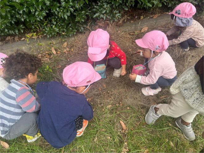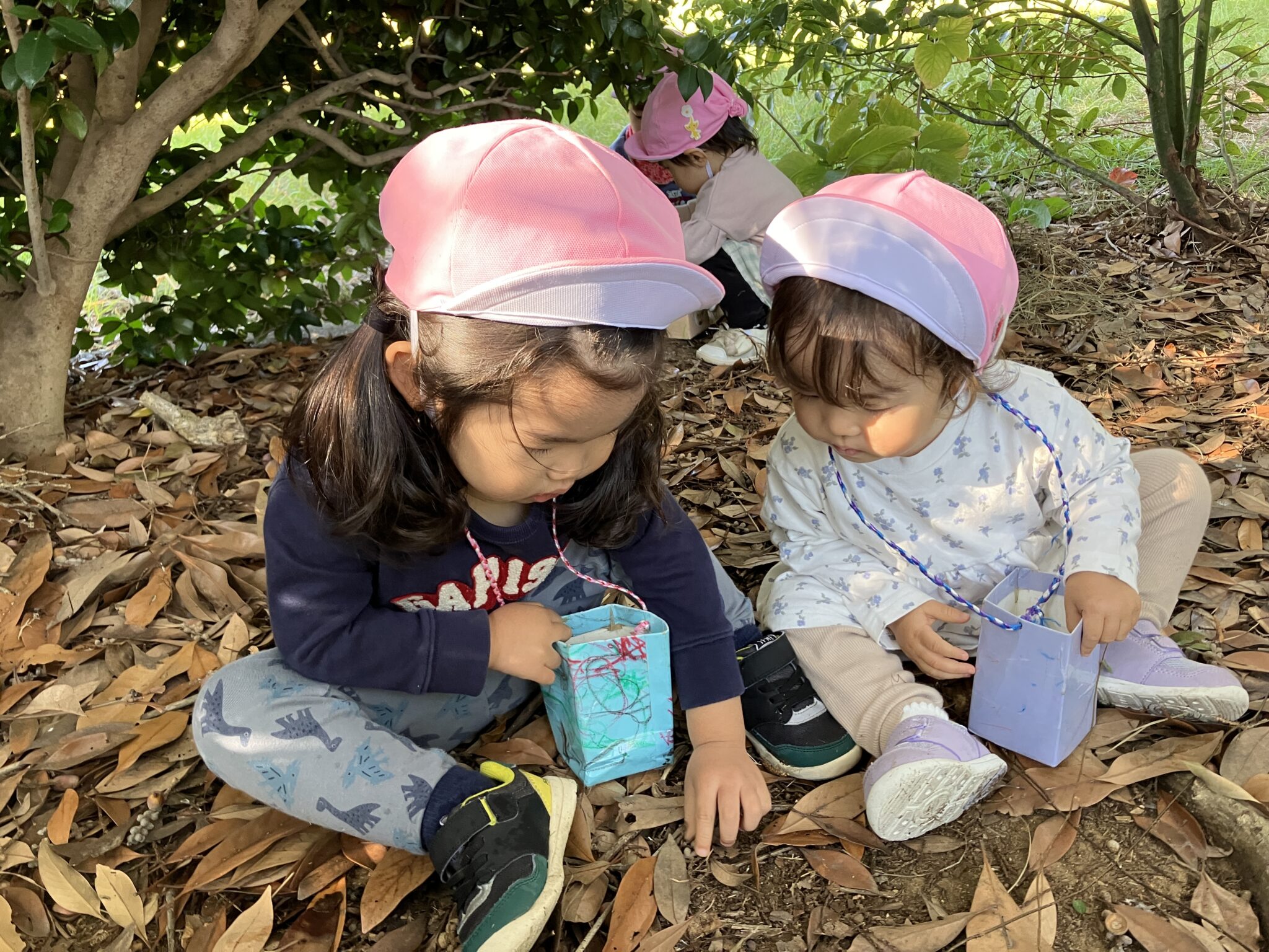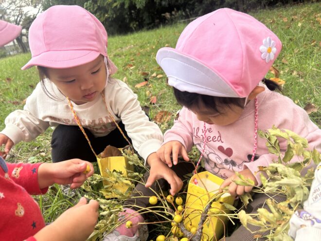 お散歩バッグを持って探索することが大好きな子どもたち。園庭でもお散歩先でも落ち葉や木の実を探して集めることに夢中になっています。