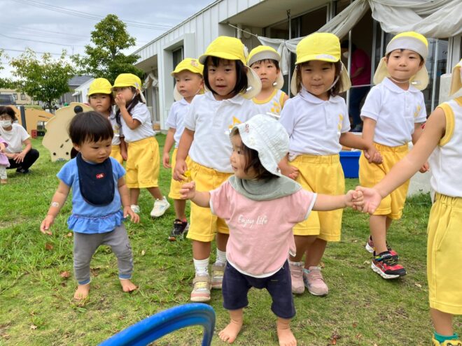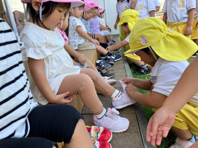 進級してから半年が経ち、お兄さん・お姉さんとしての自覚が芽生えてきた様子の子どもたち。年下の子に優しく接する姿も見られるようになってきました。夏祭り以来の年下クラスとの異年齢交流…。そっと手を差し伸べたり、靴を履くお手伝いをしたりと、お世話することを喜んでいましたよ✨
