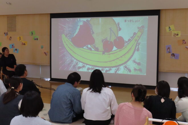 最初は朝の会…!ドキドキした表情の子どもたちでしたが、手遊びや絵本を読むにつれていつものニコニコ笑顔が見られるようになってきました😊『先生、おはようございます。皆さんおはようございます。』と元気な挨拶でスタートしました♪また、いつもとは違う大きなスクリーンで見る絵本に子どもたちは釘付けでしたね!