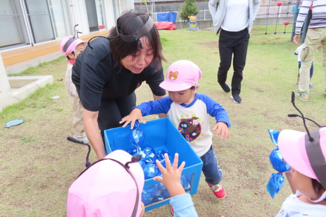 ダンスで体を動かした後は、キャンディ―集めを楽しみました。園庭中に落ちている飴を同じ色の箱に入れるゲームです。保護者の方と手を繋ぎ一生懸命探すピアノさん。まるでアリさんのようでしたよ😆