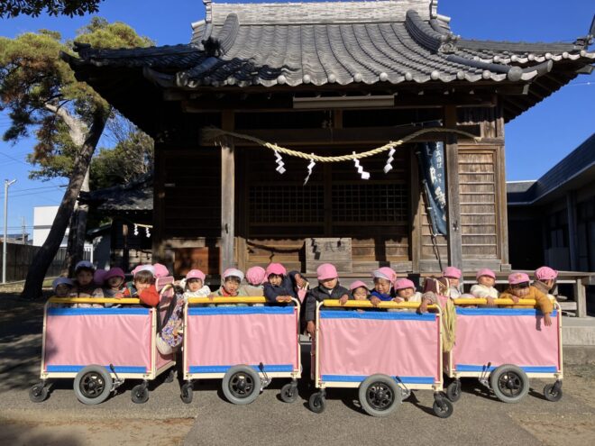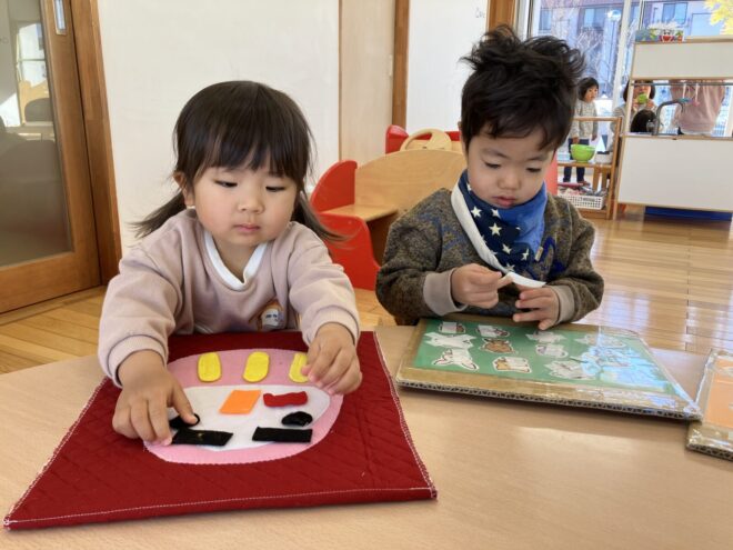正月の雰囲気を感じられるように、福笑いやお正月の塗り絵、初詣を体験しました。「これ、目?」「口はどこ?」などと自分の顔と比べながら福笑いに挑戦した子どもたち。出来上がると、「完成~!」と先生や友だちに見せ、嬉しそうな姿が見られました。椅子に座りながら集中して行う姿に、成長を感じました🎵
