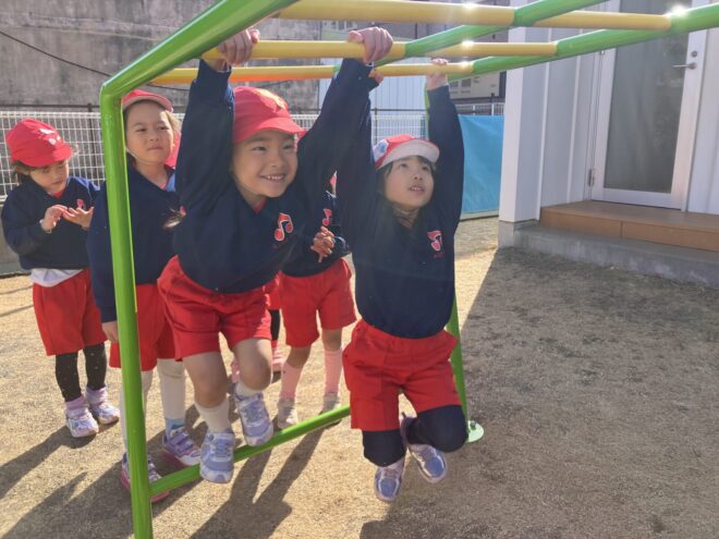 園庭では、新しく導入された“うんてい”が大流行!端から端までいけるかみんなで勝負をしたり、自分で“赤い棒のところまで頑張る”と目標を決めて取り組んだりする姿が見られました!