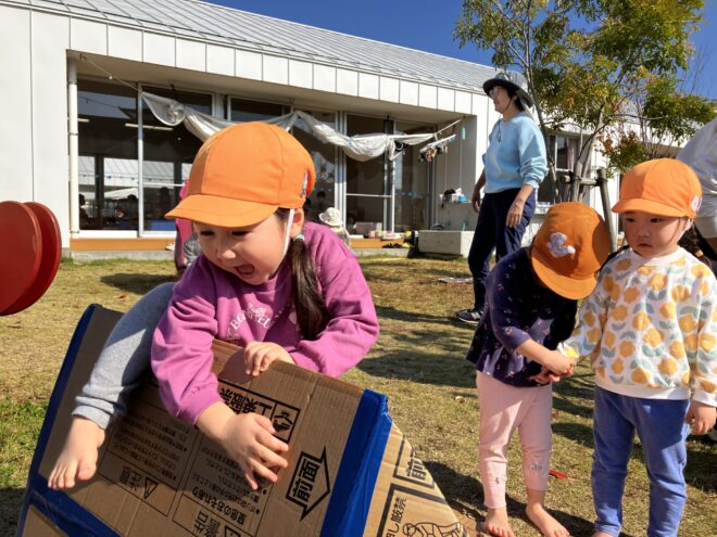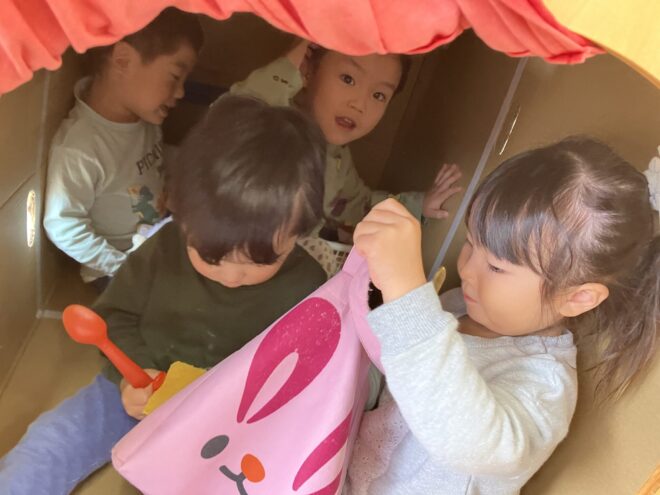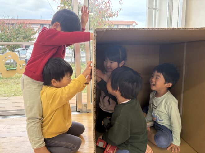 先月は『だいくのまっさん』の絵本から、カカポを使ってお家づくりを楽しんでいた子どもたち。そんな姿から子どもたちが入れる大きさの段ボールを用意すると、さっそく中に入ってお家に見立てて遊ぶ姿が見られました!「夜だから寝よう~」「7時だから学校に行かないと!」とお友だちとストーリーを作って遊ぶ姿にほっこりしました♡