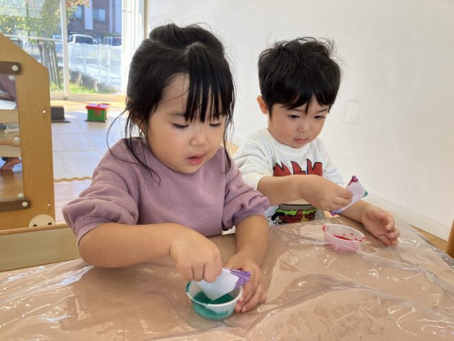 折った障子紙を絵の具につけ「1,2,3…10!」と自分で数を数えながら、色がじゅわっと広がる様子を楽しみました。