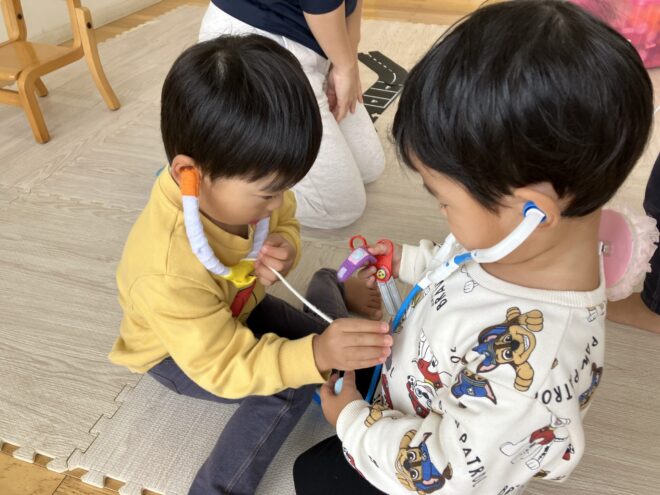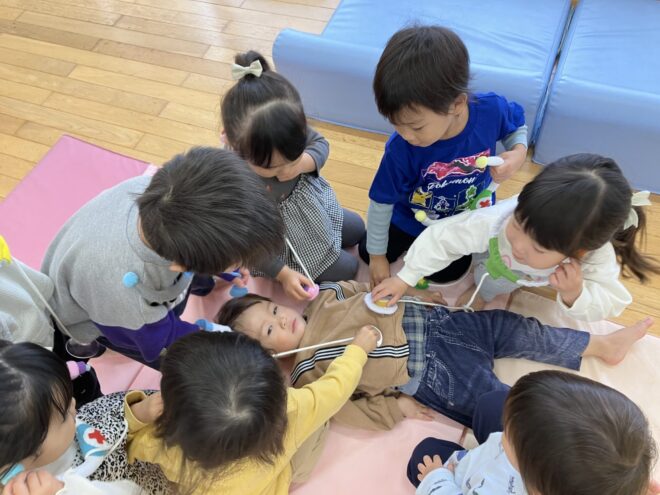 先生や友だちとイメージを共有しながら遊ぶことが増え、次第にごっこ遊びが深まってきた子どもたち。自身の経験から、ブロックなどを聴診器に見立て友だちや先生のお腹にあててみる姿から、聴診器や注射器などの玩具を用意してみると、お医者さん・患者さんになりきって遊ぶ姿が見られました。「次の方どうぞ~」「注射しますね~」とまるで本物のお医者さんのようになりきり、子どもたちの観察力や想像力に驚かされました!