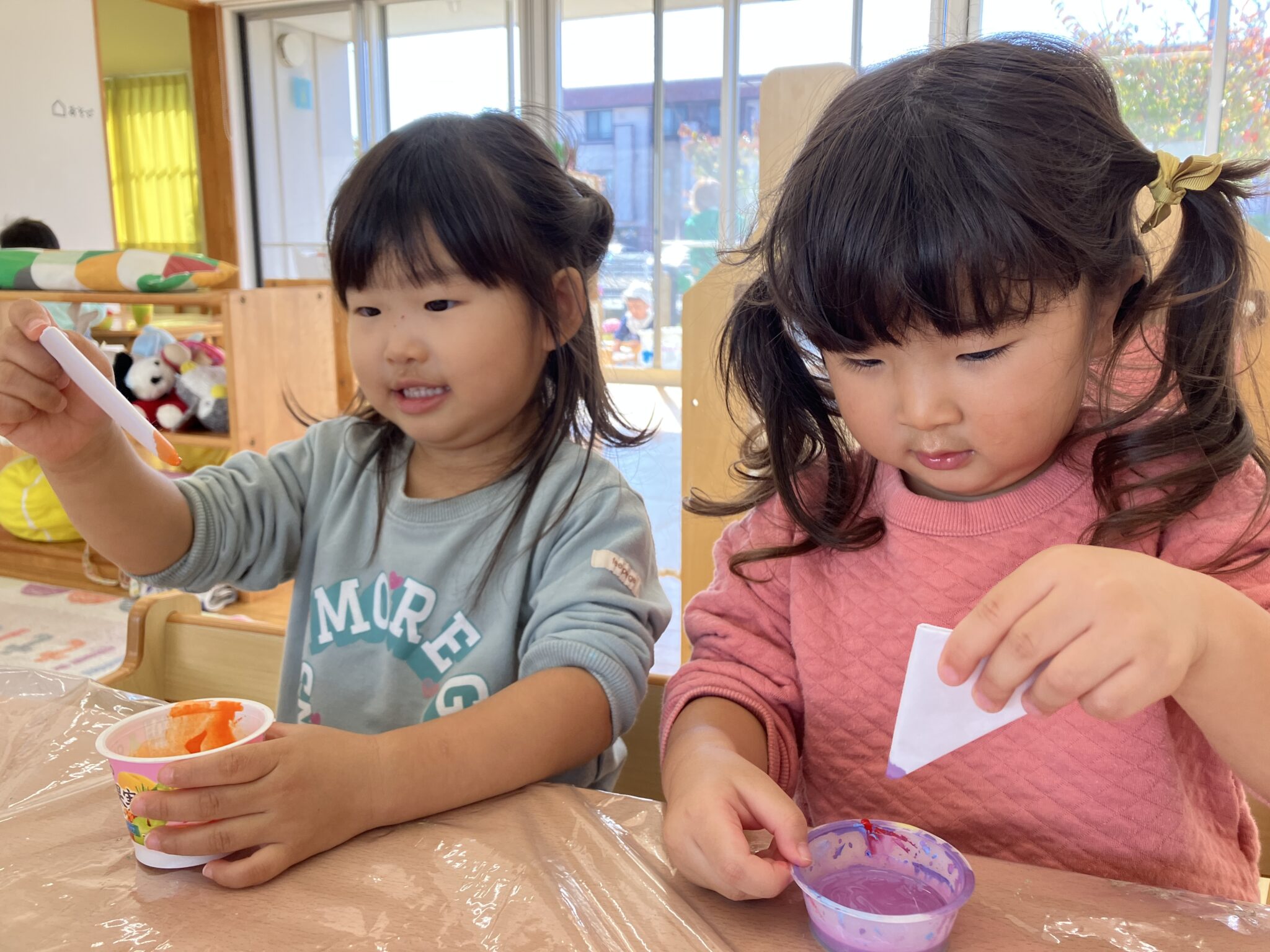折った障子紙を絵の具につけ「1,2,3…10!」と自分で数を数えながら、色がじゅわっと広がる様子を楽しみました。