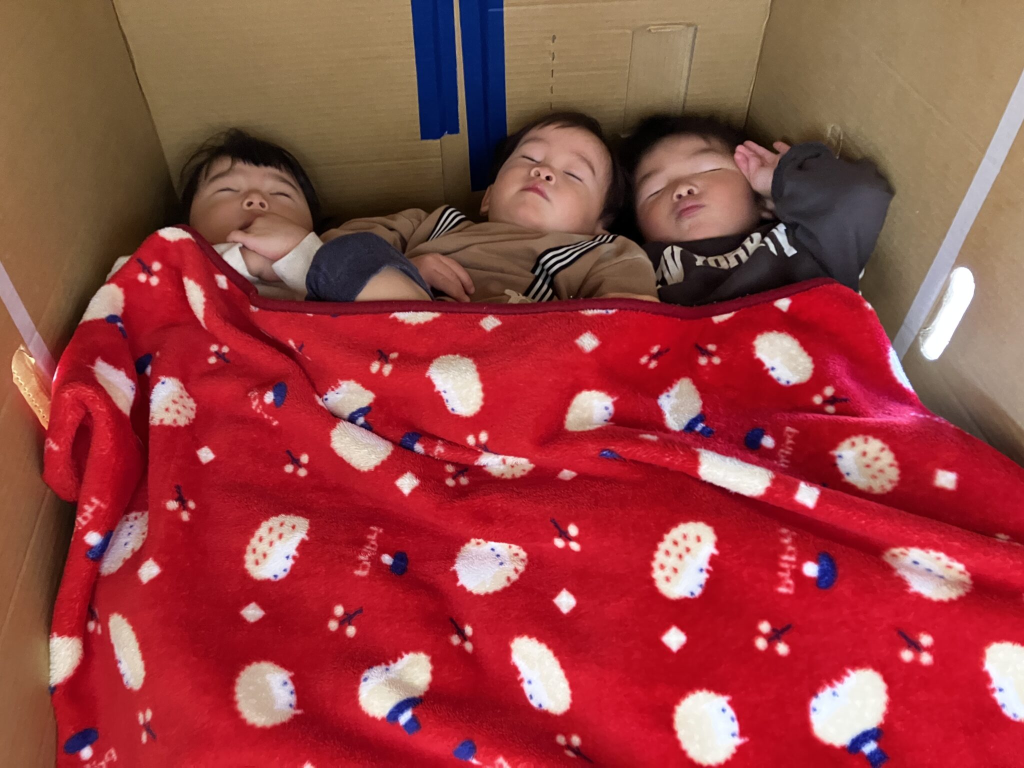 先月は『だいくのまっさん』の絵本から、カカポを使ってお家づくりを楽しんでいた子どもたち。そんな姿から子どもたちが入れる大きさの段ボールを用意すると、さっそく中に入ってお家に見立てて遊ぶ姿が見られました!「夜だから寝よう~」「7時だから学校に行かないと!」とお友だちとストーリーを作って遊ぶ姿にほっこりしました♡