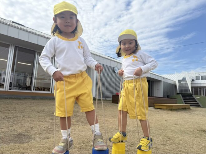 マーチさんがチャレンジしている姿を見て興味を持った「ぽっくり」。「やってみたい!」と見よう見まねで取り組んでいます。バランスがうまく取れず、足を乗せて立つことさえ難しかった子どもたちですが、何度も諦めずに挑戦するうちに歩けるようになりました✨一歩ずつ慎重に進む姿に成長を感じます!