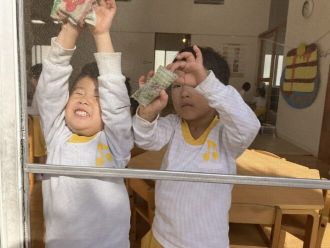 次は雑巾掛けに挑戦。手首を捻るとしっかり絞れることを伝えると、全身に力が入り口を尖らせながら絞っていました(笑)その後はロッカーや棚、床だけでなく網戸も拭いてピカピカになった部屋に満足げなチェロさんでした🫧