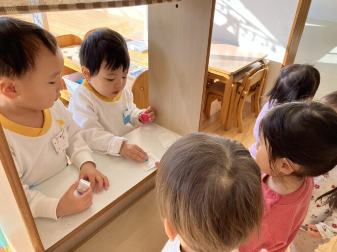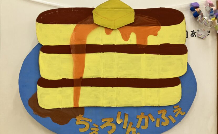 先月から楽しんできたホットケーキ作り。たくさんのケーキができたのでカフェを開こうと、メニューを増やしたり飲み物を用意したり、飾りも作っていきました。何の仕事をするか係も決め、チラシも配って準備万端です。初日はちょっぴり緊張したようで声も動きも固め…😖その日のうちにどうすればお客さんに喜んでもらえるか作戦会議を行い、役割の見直しやセリフを考えていました。