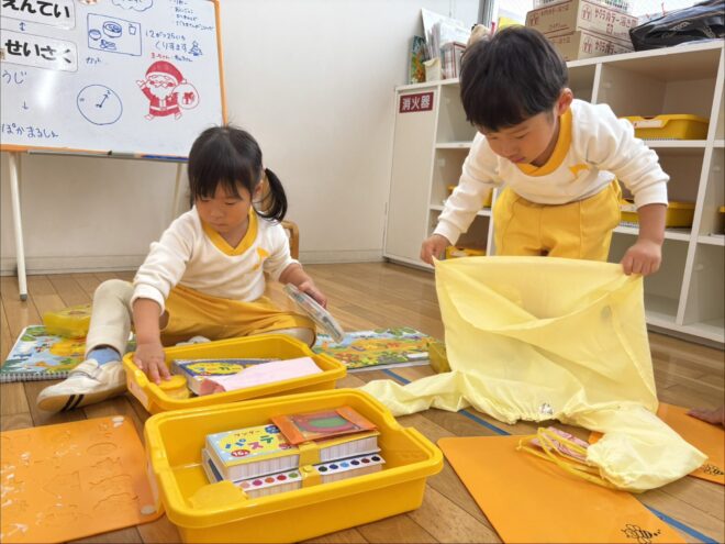 まずはお道具箱の整理整頓からスタート!出して畳んで並べて入れて…うまく蓋が閉まらないとまた出してやり直す姿が見られました。