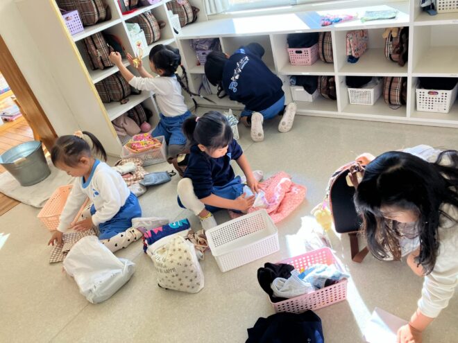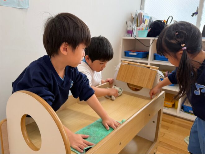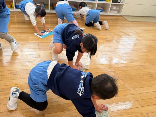 年末が近づいてきたので、みんなで大掃除をしていきました。「ここ汚れてるから拭いたよ」「たくさん掃除したから雑巾が真っ黒になった」と子どもたち同士で気づいたことを伝え合いながらロッカーの中を整頓したり棚や床を拭いたりと意欲的に取組んでいたフォルテさん。途中「掃除って大変だね」という声が聞こえ、実際に経験したからこそ身の回りのものを大切にする気持ちやいつも使う場所を綺麗に保つことの大切さに気づく良い経験となりました。