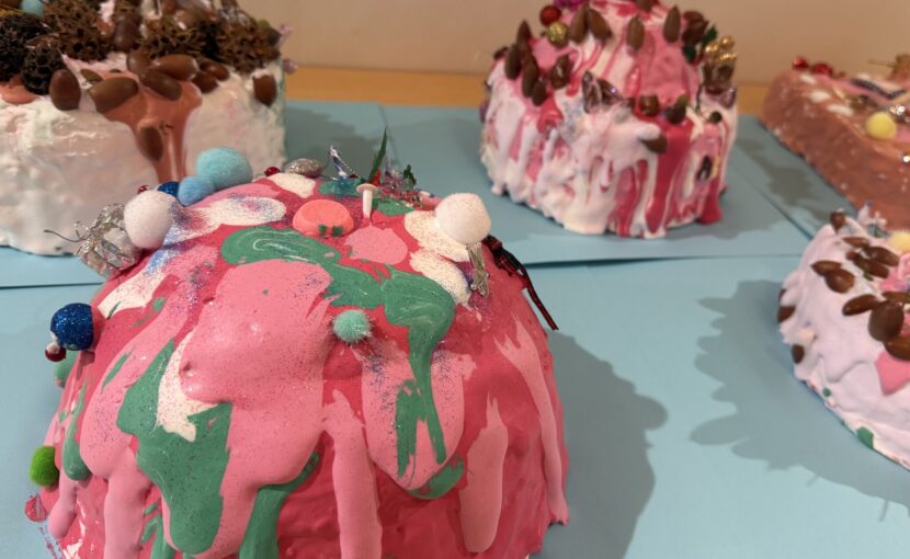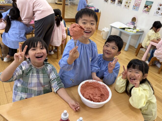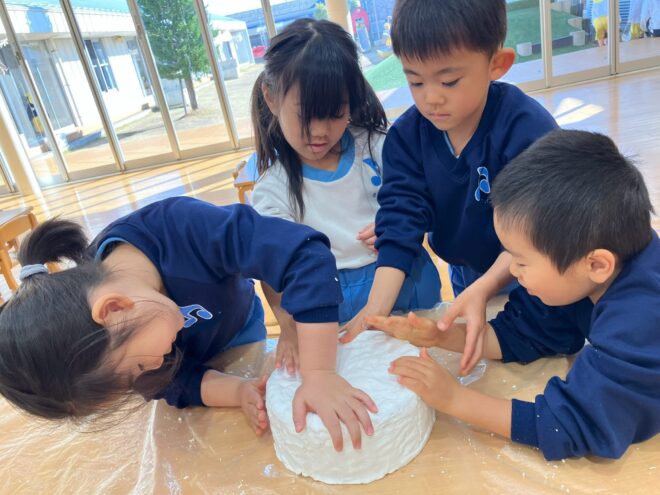 クリスマスに向けてみんなでケーキ作りをしていきました。まずはグループに分かれ形や大きさを考える所からスタート。形が決まると土台を作っていきました。そして大切なクリーム作り。泡立て器を使い紙粘土を混ぜていきました。力が必要な作業でしたが、「手が疲れてきた…」と言いながらもグループの友だちと協力しながら最後まで必死に混ぜ、感触や変化を楽しみながら当日に向けて準備を進めていくことができました。そしてクリスマス当日は楽しみにしていたケーキのデコレーションを行いました。自分たちで拾ってきた木の実も飾りに使い、とっても素敵なクリスマスケーキが完成しました。