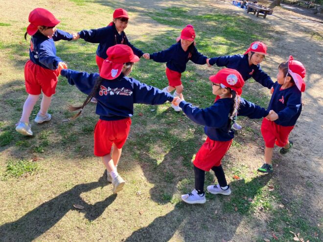 お弁当を食べた後は、みんなで円になってフォークダンスの「マイム・マイム」をしていきました!子どもたちの笑顔が絶えない楽しい時間になりました♬