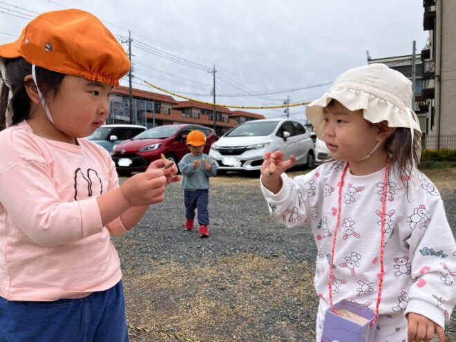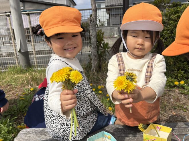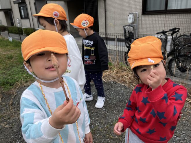 天気のよい日には、みんなで散歩にも出掛けました。冬とは違い、さまざまな植物が顔を出し始め、「これ、お土産にするの!」と嬉しそうに摘む姿も見られます。春の自然に積極的に触れている子どもたちです。