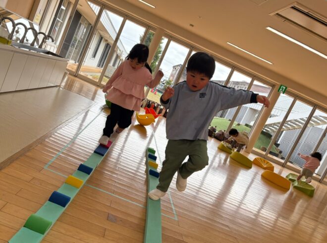以上児棟で過ごすようになり、異年齢での関わりもより一層増えてきました。「今日もにいにとあそぶ?」「マーチさん、きてくれるのかな?」と憧れの気持ちを抱きながら、一緒に遊ぶことを楽しんでいます。
