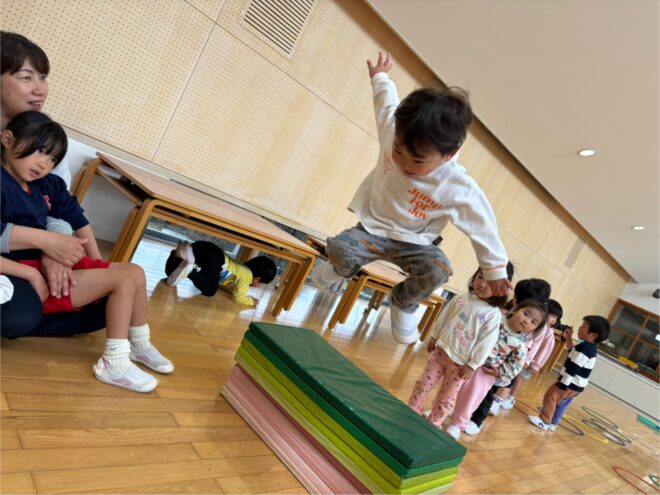 また、雨の日が続いた下旬には、コンチェルトで運動遊びを楽しみました。体の使い方もぐんと発達し、鉄棒やマット、平均台など、好きな運動器具を使いながら元気いっぱい体を動かしています。「せんせ~!みててね~!」と、できるようになったことを自信満々に見せてくれる姿がとても頼もしいです。
