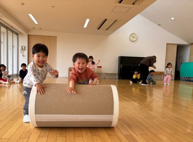 丸太転がしに挑戦!まっすぐ進むことが難しそうでしたが、コロコロ進むことが面白かったようで、笑顔で取り組むことが出来ました。