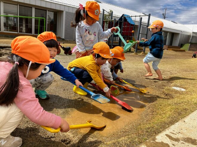 その後、そっと水たまりに近づき、靴が濡れないように「ぴちゃり…」と慎重に触れてみる姿も。先生に「靴を脱いでからね」と声を掛けられると、嬉しそうに水の中へ入っていきました。その様子を見て、周りの子どもたちも集まり、スコップを使いながら水に触れることを楽しんでいました。