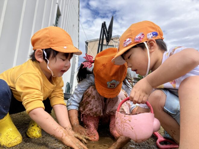 後半は、思い切って泥遊び!”汚れたら着替えられる”安心感の中で夢中になって遊ぶことが出来ました!