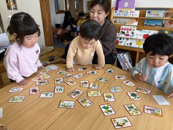室内では『おやおやおやさい』シリーズのカルタに興味をもち、夢中になって楽しんでいます✋