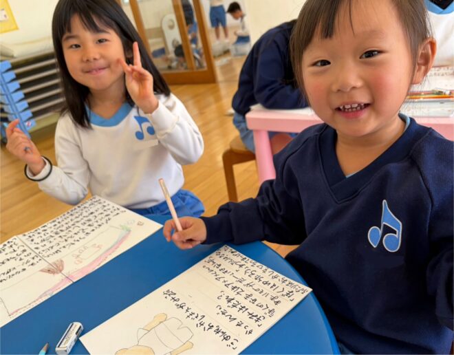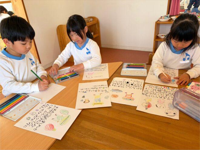 また今月は、一年間のまとめとして「旬の食べ物」をテーマに、みんなで絵本作りにも挑戦しました。お話を考える子、文字を書く子、イメージした絵を描く子など、それぞれがやりたい役割を選び、制作がスタート。お友だちや先生と話し合いながら、力を合わせて取り組んできました。